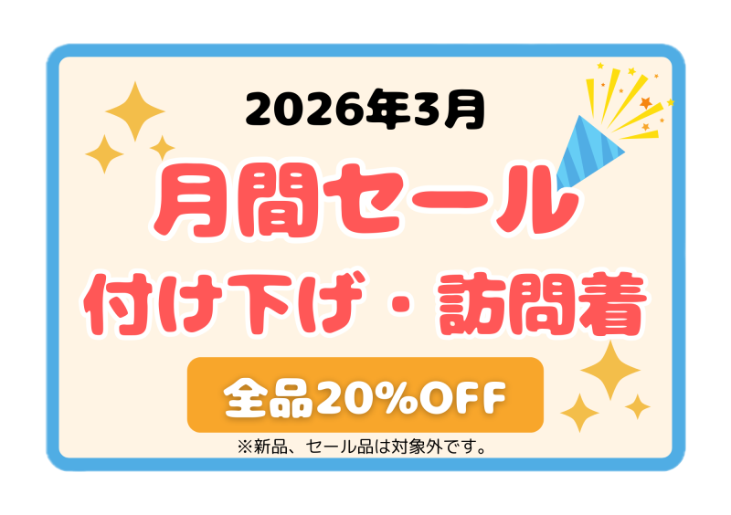 まるたけ 令和8年3月の月間セールのご案内盛岡サンサ店 2026.03.02春寒の候、寒さのなかにも、春の気配を感じる頃となりました。卒業、入学のシーズンですね。お店でも式典用の着物を探しに来る方が多いです。きものリサイクルまるたけ令和8年3月の月間セールは、「付下げ・訪問着」です。新品とセール品以外、全品20%OFFになります。盛岡都南方面にお越しの際は、お気軽にお立ち寄りください。ご来店お待ちしております。